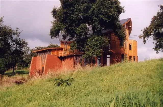 Ossature bois, éco-construction, apports solaires passifs, mur masse en terre crue, valorisation complète de l'eau de pluie (autonomie), chauffage au bois.